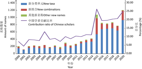 圖1 2000–2020年中國學(xué)者發(fā)表菌物新名稱數(shù)量及在世界的貢獻(xiàn)