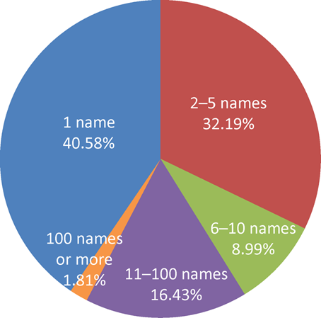 近21年間,有27位中國學(xué)者發(fā)表了100個(gè)以上的新分類單元,這些學(xué)者構(gòu)成了我國菌物分類學(xué)的中堅(jiān)力量,分類學(xué)產(chǎn)出大多穩(wěn)定且高效,為揭示我國乃至世界菌物多樣性做出了突出貢獻(xiàn)(表1)。此外,發(fā)表新名稱數(shù)量在5個(gè)以下的學(xué)者有1085位,占中國作者總數(shù)的70%,而僅發(fā)表1個(gè)新名稱的作者占到了40.58%,其中多數(shù)可能是研究生、客座學(xué)生、臨時(shí)聘用人員等短期從事菌物分類研究的人員(圖2)。